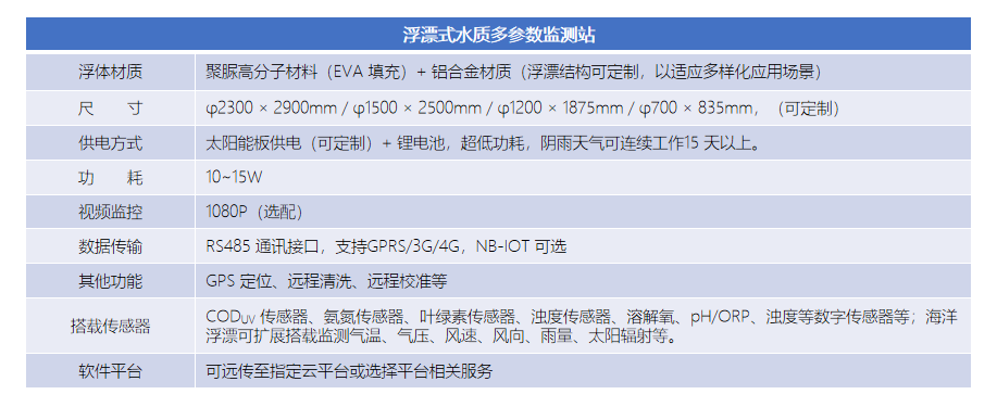 | 搭載傳感器 | CODwv 傳感器、氨氮傳感器、葉綠素傳感器、濁度傳感器、溶解氧、pH/ORP、濁度等數(shù)字傳感器等;海洋浮漂可擴(kuò)展搭載監(jiān)測(cè)氣溫、氣壓、風(fēng)速、風(fēng)向、雨量、太陽(yáng)輻射等。 |